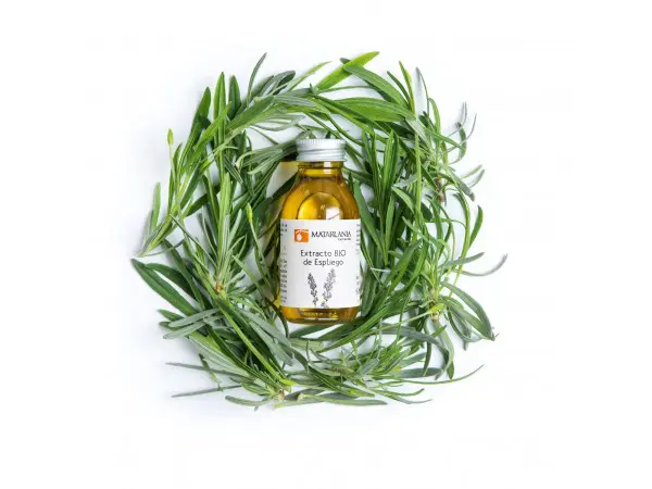 Maceración al 10% de espliego (lavanda) ecológico en aceite de oliva virgen extra ecológico. Método tradicional de 21 días a Sol y Serena.