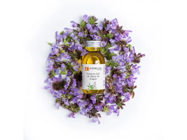 Maceración al 10% de sumidades floridas de Salvia de Aragón ecológicas en aceite de oliva virgen extra ecológico. Método tradicional de 21 días a Sol y Serena.