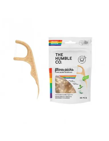 Hilo dental con mango de un 53% origen vegetal que facilita la higiene bucal.