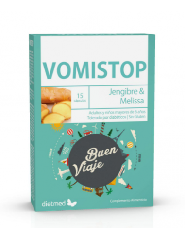 ¡Vomistop es un suplemento alimenticio natural que ayuda a prevenir las náuseas, por lo que puede dar un paseo sin tener el estómago revuelto! ¡Las cápsulas de Vomistop, basadas en Ginger and Glass Herb, permiten que adultos y niños a partir de 6 años viajen sin náuseas o náuseas! El jengibre alivia los vómitos y la indigestión; La hierba de limón ayuda a la digestión.
